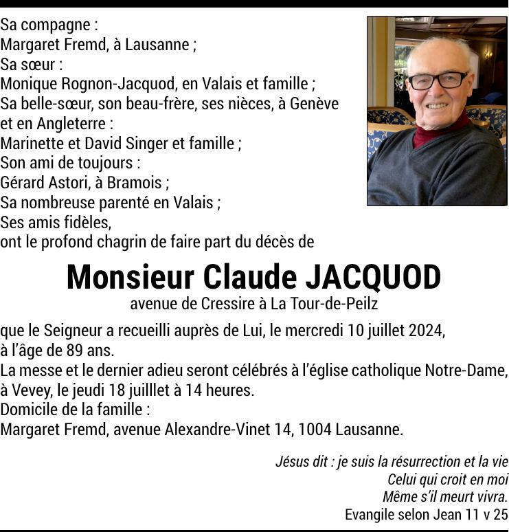 Monsieur Claude JACQUOD 16 avr. 1935 - 10 juil. 2024 Avis mortuaire PFG Partager sur: Galerie PreviousNext PreviousNext