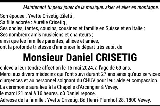 Monsieur Daniel CRISETIG 16 nov. 1954 - 16 mai. 2024 Avis mortuaire PFG Télecharger PDF Partager sur: Galerie PreviousNext PreviousNext
