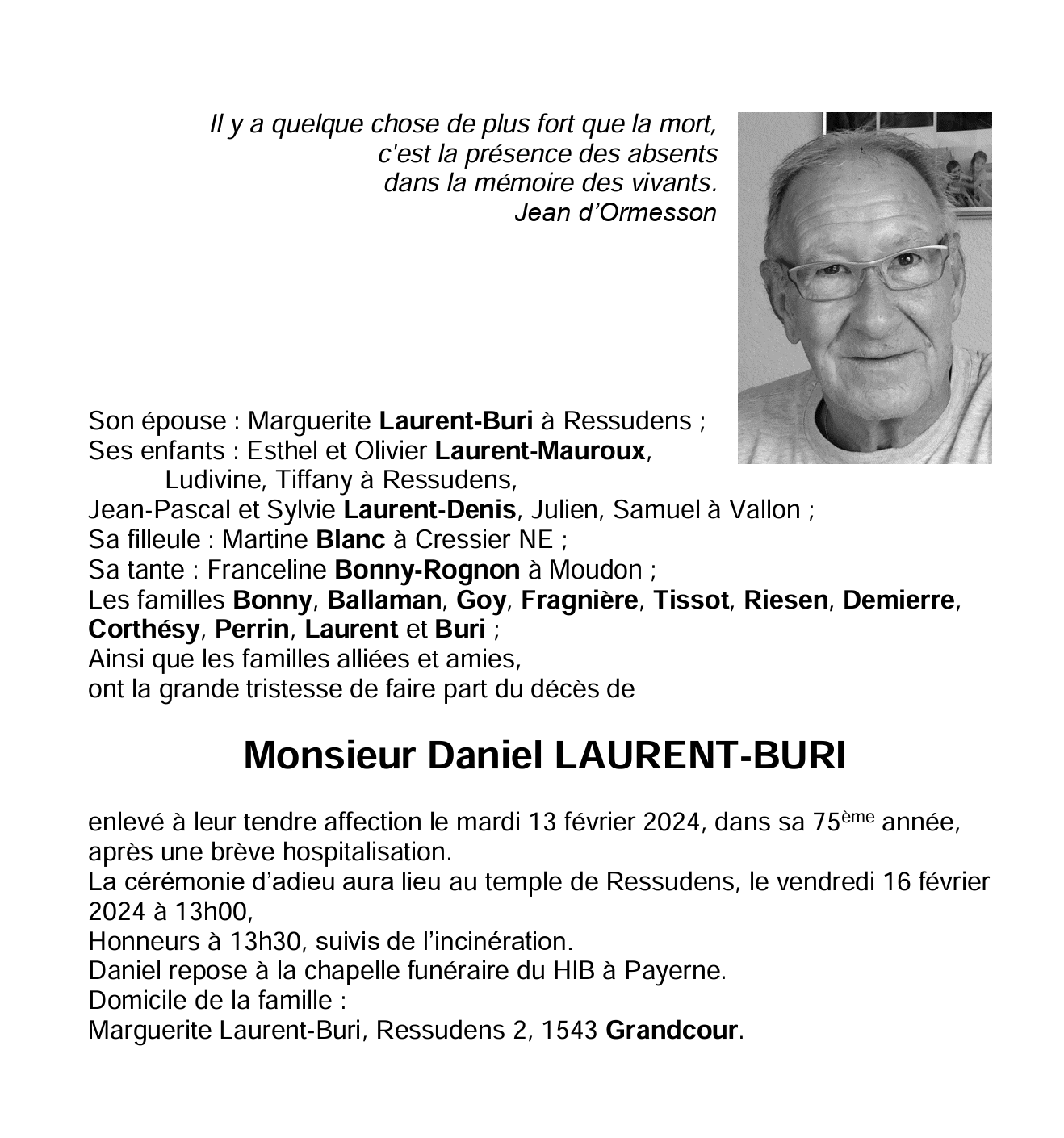 Monsieur Daniel LAURENT-BURI 01 déc. 1949 - 13 fév. 2024 Avis mortuaire PFG Télecharger PDF Partager sur: Galerie PreviousNext PreviousNext