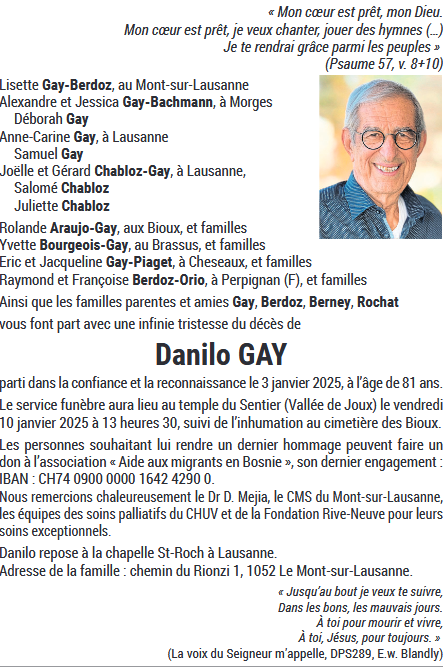 Monsieur Danilo GAY 09 mar. 1943 - 03 jan. 2025 Avis mortuaire PFG Télecharger PDF Partager sur: Galerie