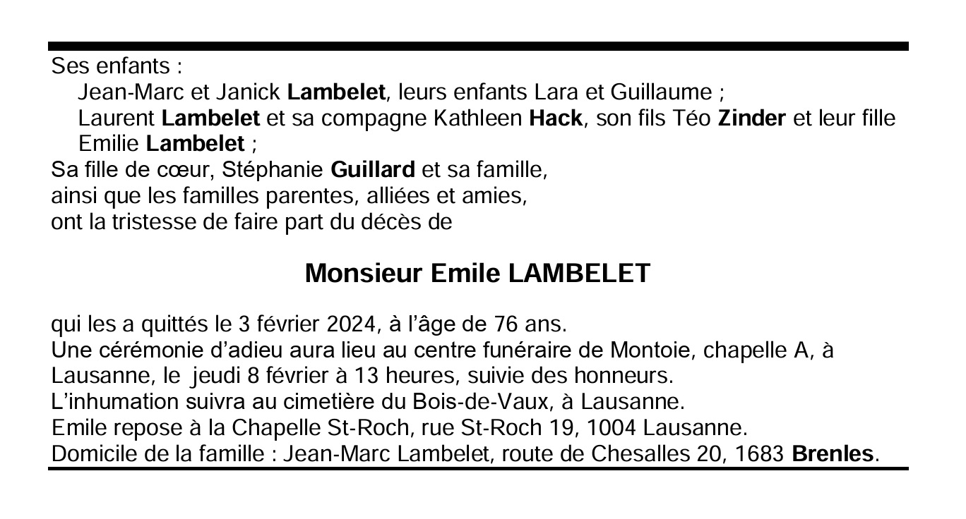 Monsieur Emile LAMBELET 02 oct. 1947 - 03 fév. 2024 Avis mortuaire PFG Télecharger PDF Partager sur: Galerie PreviousNext PreviousNext