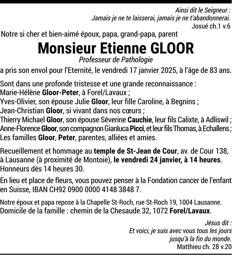 Monsieur Etienne GLOOR 18 nov. 1941 - 17 jan. 2025 Avis mortuaire PFG Partager sur: Galerie PreviousNext PreviousNext