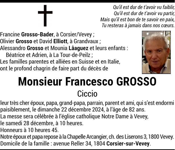 Monsieur Francesco GROSSO 11 fév. 1942 - 22 déc. 2024 Avis mortuaire PFG Partager sur: Galerie PreviousNext PreviousNext