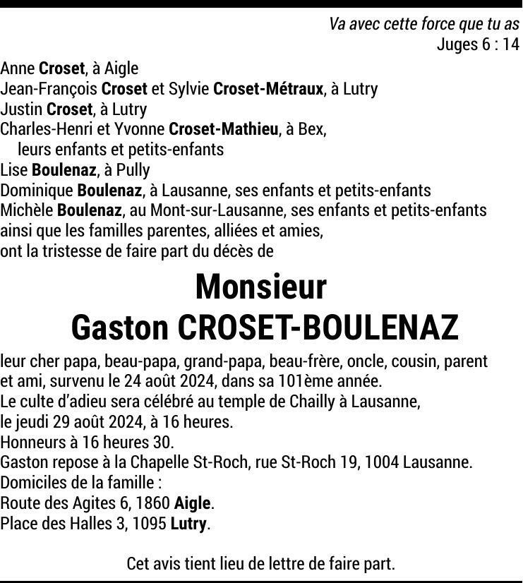 Monsieur Gaston CROSET-BOULENAZ 28 juil. 1924 - 24 aoû. 2024 Avis mortuaire PFG Partager sur: Galerie PreviousNext PreviousNext