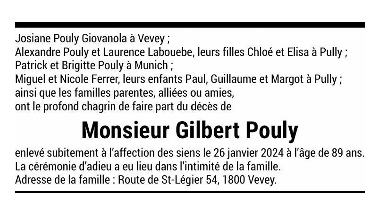 Monsieur Gilbert POULY 16 juil. 1934 - 26 jan. 2024 Avis mortuaire PFG Télecharger PDF Partager sur: Galerie PreviousNext PreviousNext