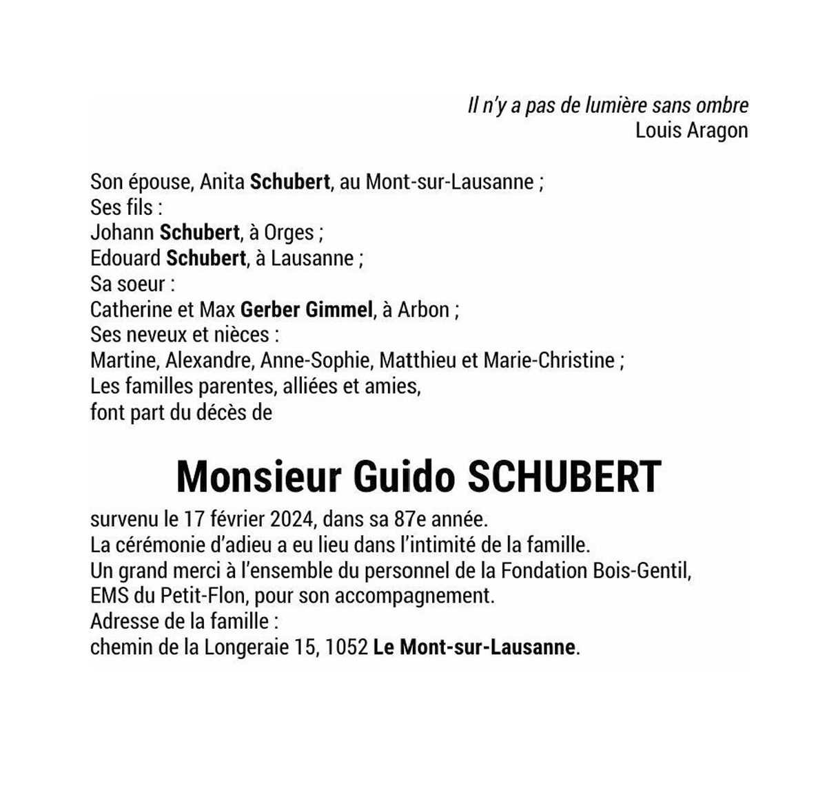 Monsieur Guido SCHUBERT 03 mai. 1937 - 17 fév. 2024 Avis mortuaire PFG Télecharger PDF Partager sur: Galerie PreviousNext PreviousNext