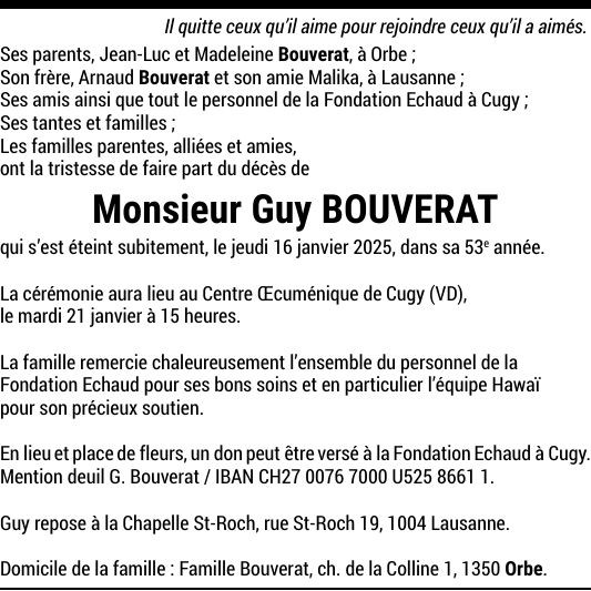 Monsieur Guy BOUVERAT 28 nov. 1972 - 16 jan. 2025 Avis mortuaire PFG Partager sur: Galerie PreviousNext PreviousNext