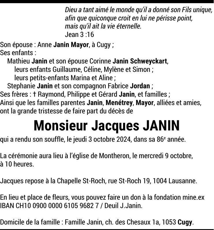 Monsieur Jacques JANIN 04 mar. 1939 - 03 oct. 2024 Avis mortuaire PFG Partager sur: Galerie PreviousNext PreviousNext