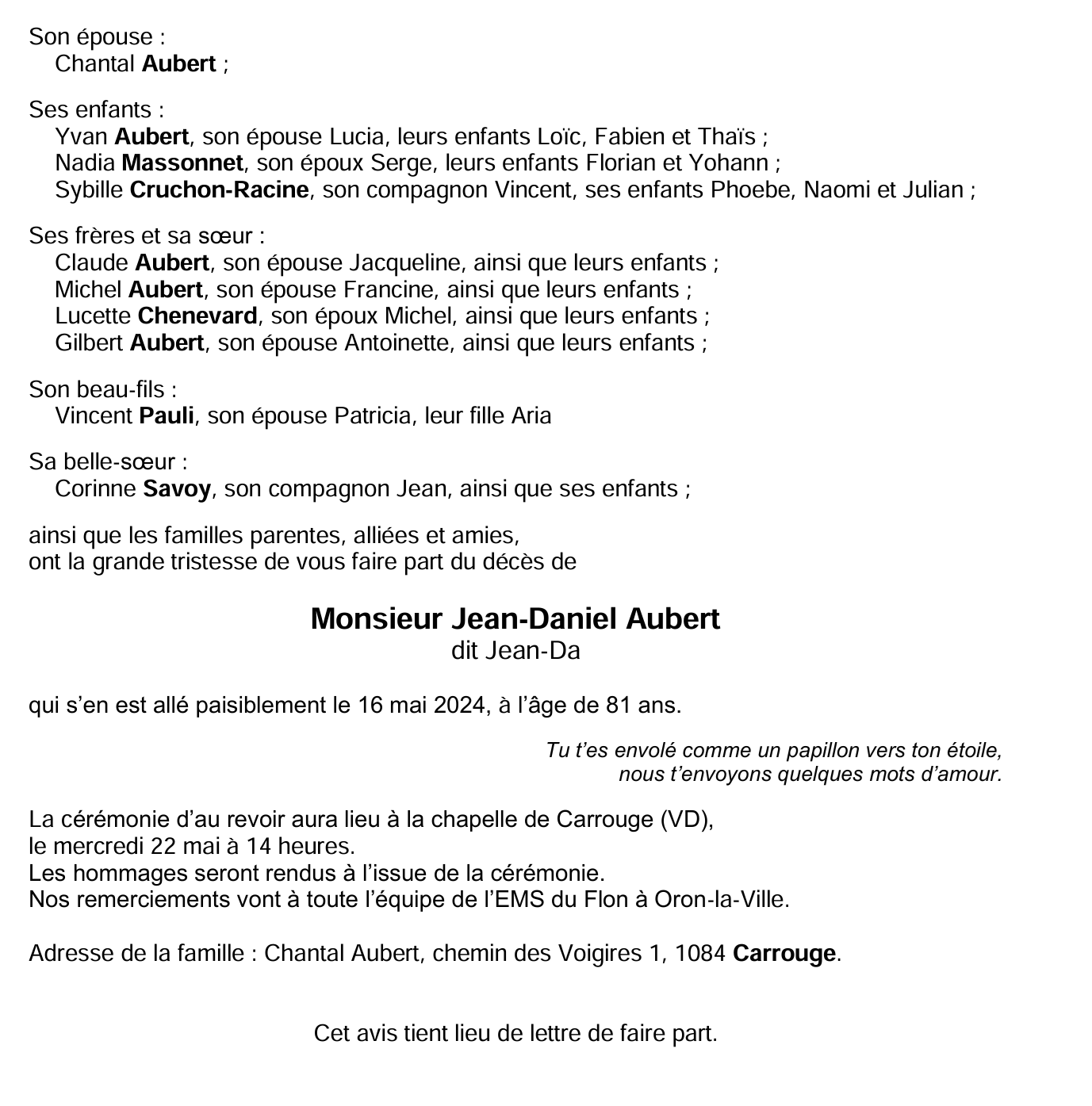 Monsieur Jean-Daniel AUBERT 12 mai. 1943 - 16 mai. 2024 Avis mortuaire PFG Télecharger PDF Partager sur: Galerie PreviousNext PreviousNext