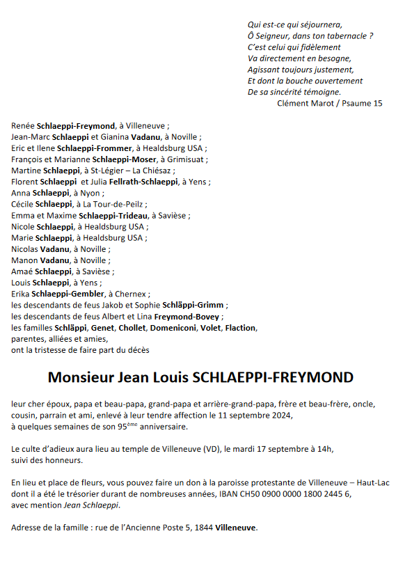 Monsieur Jean Louis SCHLAEPPI-FREYMOND 03 oct. 1929 - 11 sep. 2024 Avis mortuaire PFG Télecharger PDF Partager sur: Galerie PreviousNext PreviousNext