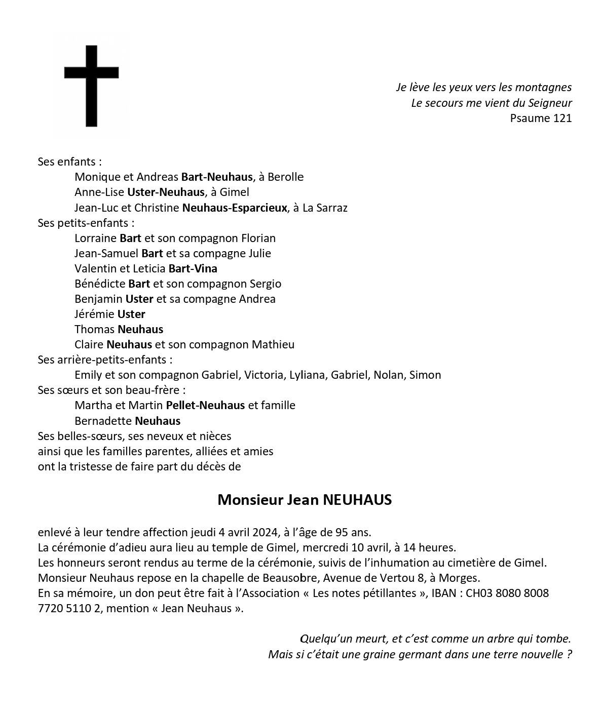 Monsieur Jean NEUHAUS 16 mar. 1929 - 04 avr. 2024 Avis mortuaire PFG Télecharger PDF Partager sur: Galerie PreviousNext PreviousNext
