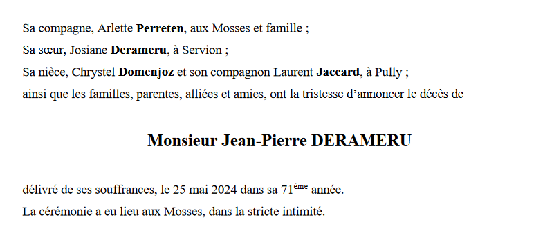Monsieur Jean-Pierre DERAMERU 13 oct. 1953 - 25 mai. 2024 Avis mortuaire PFG Télecharger PDF Partager sur: Galerie PreviousNext PreviousNext