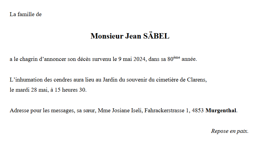 Monsieur Jean SÄBEL 27 oct. 1944 - 09 mai. 2024 Avis mortuaire PFG Télecharger PDF Partager sur: Galerie PreviousNext PreviousNext