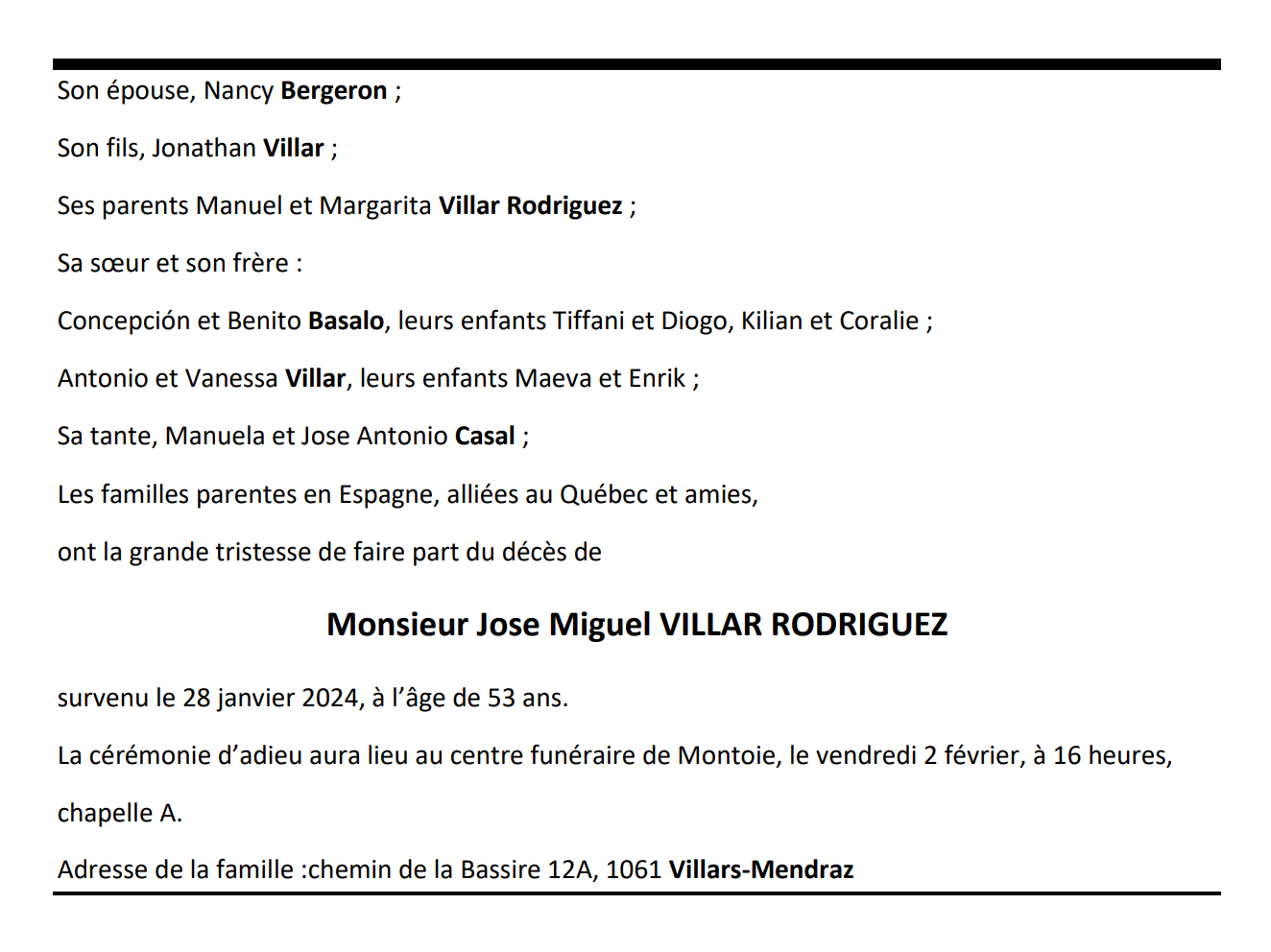 Monsieur Jose Miguel VILLAR RODRIGUEZ 02 jan. 1971 - 28 jan. 2024 Avis mortuaire PFG Télecharger PDF Partager sur: Galerie PreviousNext PreviousNext