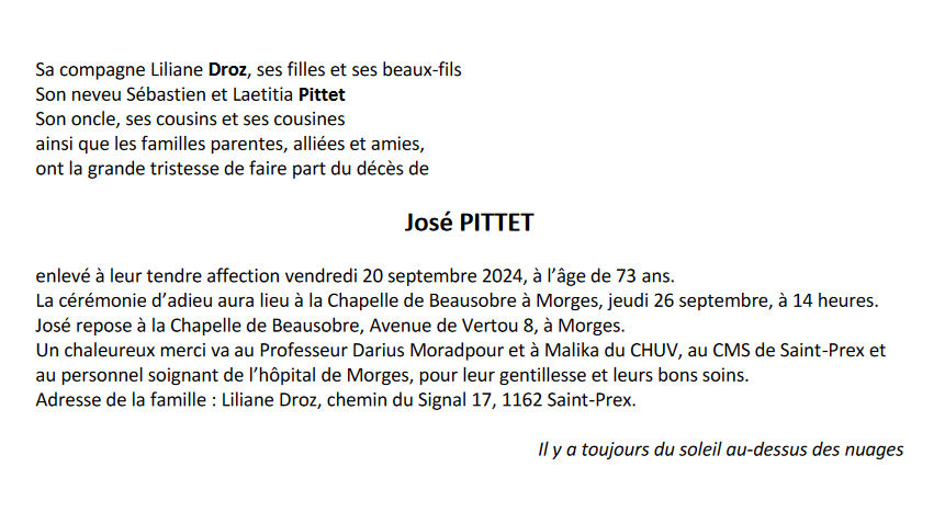 Monsieur José PITTET 05 aoû. 1951 - 20 oct. 2024 Avis mortuaire PFG Télecharger PDF Partager sur: Galerie