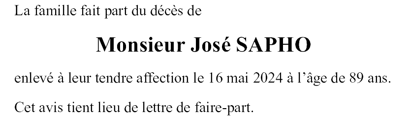 Monsieur José SAPHO 09 nov. 1934 - 16 mai. 2024 Avis mortuaire PFG Partager sur: Galerie PreviousNext PreviousNext
