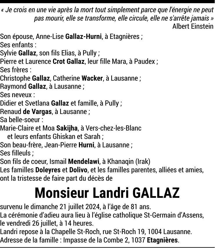 Monsieur Landri GALLAZ 31 mar. 1943 - 21 juil. 2024 Avis mortuaire PFG Partager sur: Galerie PreviousNext PreviousNext