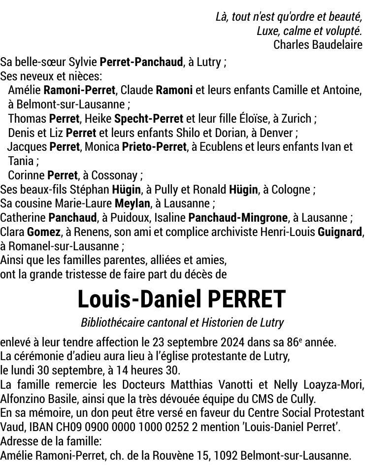 Monsieur Louis-Daniel PERRET 24 mar. 1939 - 23 sep. 2024 Avis mortuaire PFG Partager sur: Galerie PreviousNext PreviousNext