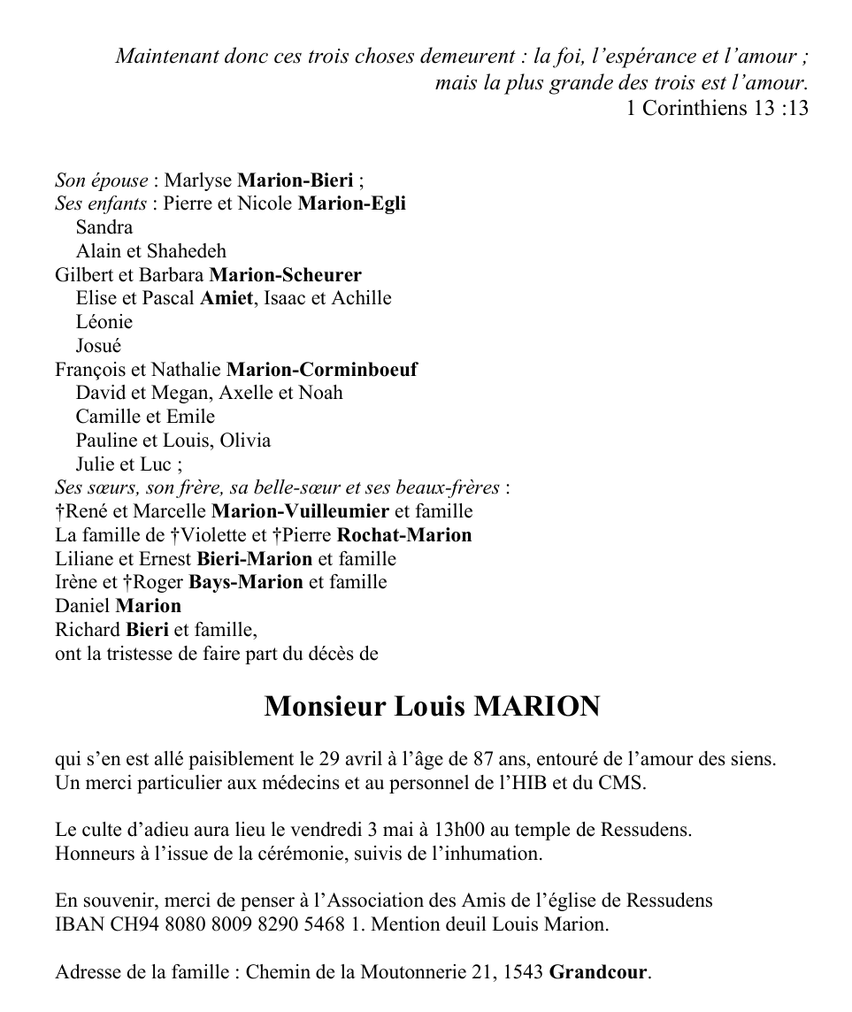 Monsieur Louis MARION 21 jan. 1937 - 29 avr. 2024 Avis mortuaire PFG Télecharger PDF Partager sur: Galerie