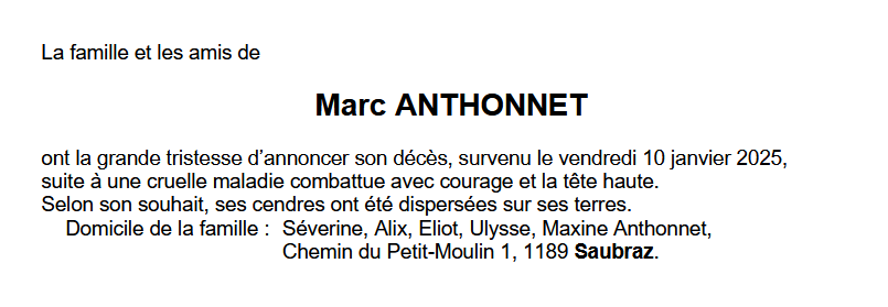Monsieur Marc ANTHONNET 28 mar. 1971 - 10 jan. 2025 Avis mortuaire PFG Télecharger PDF Partager sur: Galerie
