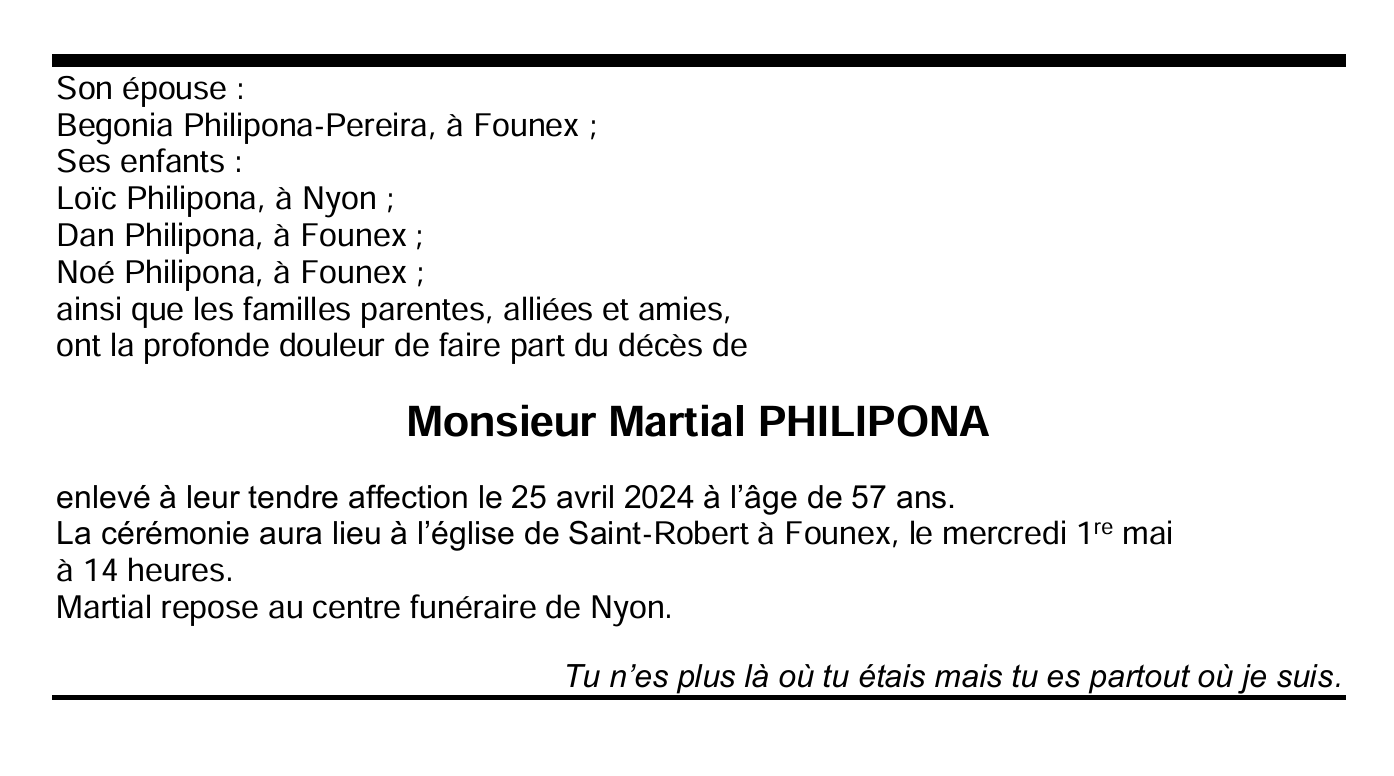 Monsieur Martial PHILIPONA 23 jan. 1967 - 25 avr. 2024 Avis mortuaire PFG Télecharger PDF Partager sur: Galerie PreviousNext PreviousNext