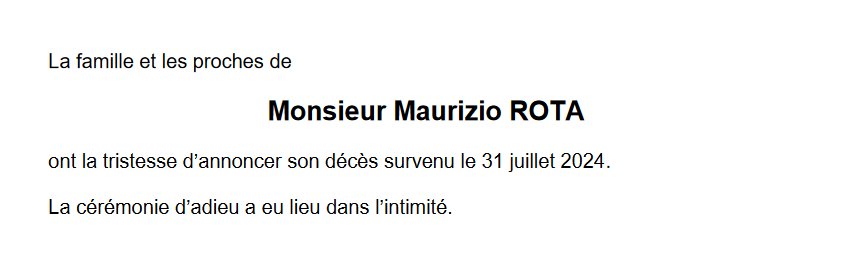 Monsieur Maurizio ROTA 16 oct. 1963 - 31 juil. 2024 Avis mortuaire PFG Télecharger PDF Partager sur: Galerie