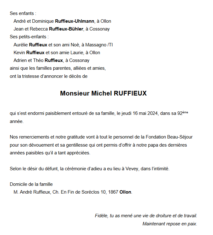 Monsieur Michel RUFFIEUX 09 juil. 1932 - 16 mai. 2024 Avis mortuaire PFG Télecharger PDF Partager sur: Galerie PreviousNext PreviousNext
