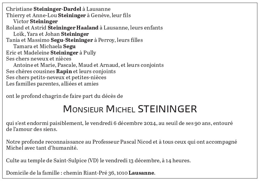 Monsieur Michel STEININGER 05 fév. 1935 - 06 déc. 2024 Avis mortuaire PFG Télecharger PDF Partager sur: Galerie PreviousNext PreviousNext