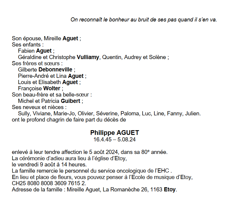 Monsieur Philippe AGUET 16 avr. 1945 - 05 aoû. 2024 Avis mortuaire PFG Télecharger PDF Partager sur: Galerie