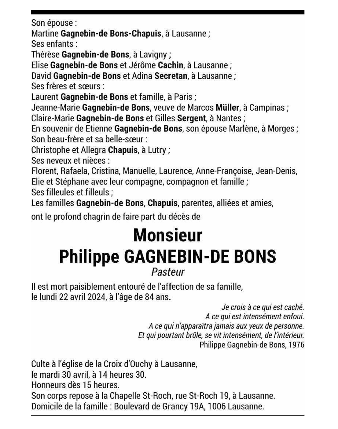 Monsieur Philippe GAGNEBIN-DE-BONS 31 aoû. 1939 - 22 avr. 2024 Avis mortuaire PFG Télecharger PDF Partager sur: Galerie PreviousNext PreviousNext