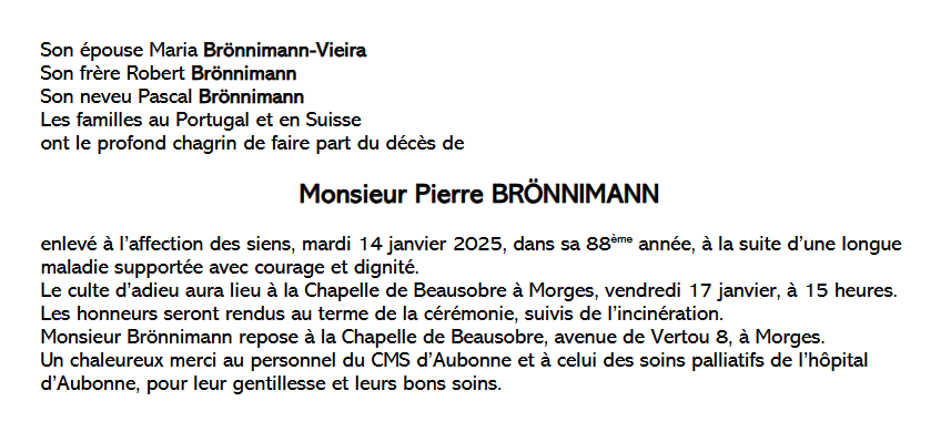 Monsieur Pierre BRÖNNIMANN 05 déc. 1937 - 14 jan. 2025 Avis mortuaire PFG Télecharger PDF Partager sur: Galerie