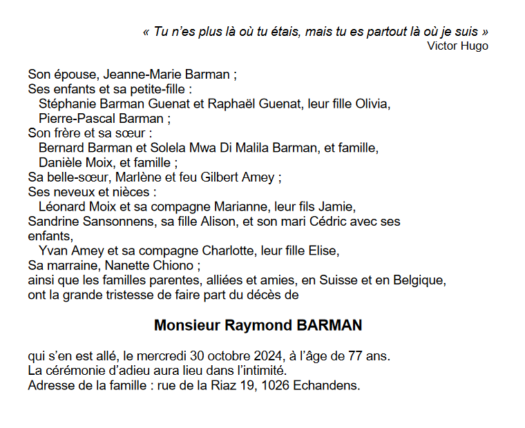 Monsieur Raymond BARMAN 11 mar. 1947 - 30 oct. 2024 Avis mortuaire PFG Télecharger PDF Partager sur: Galerie