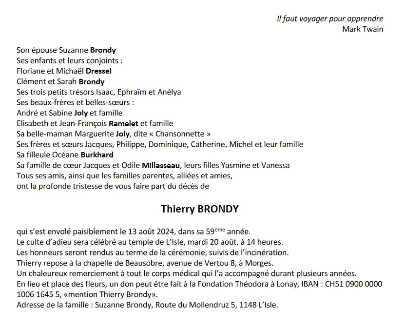 Monsieur Thierry BRONDY 23 oct. 1965 - 13 aoû. 2024 Avis mortuaire PFG Télecharger PDF Partager sur: Galerie PreviousNext PreviousNext