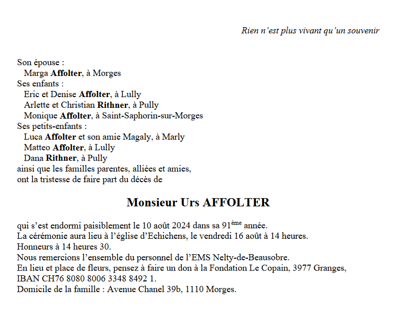 Monsieur Urs AFFOLTER 05 déc. 1933 - 10 aoû. 2024 Avis mortuaire PFG Télecharger PDF Partager sur: Galerie PreviousNext PreviousNext