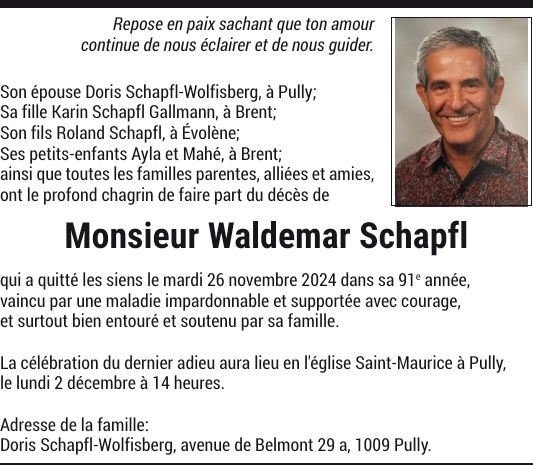 Monsieur Waldemar SCHAPFL 27 mai. 1934 - 26 nov. 2024 Avis mortuaire PFG Partager sur: Galerie PreviousNext PreviousNext